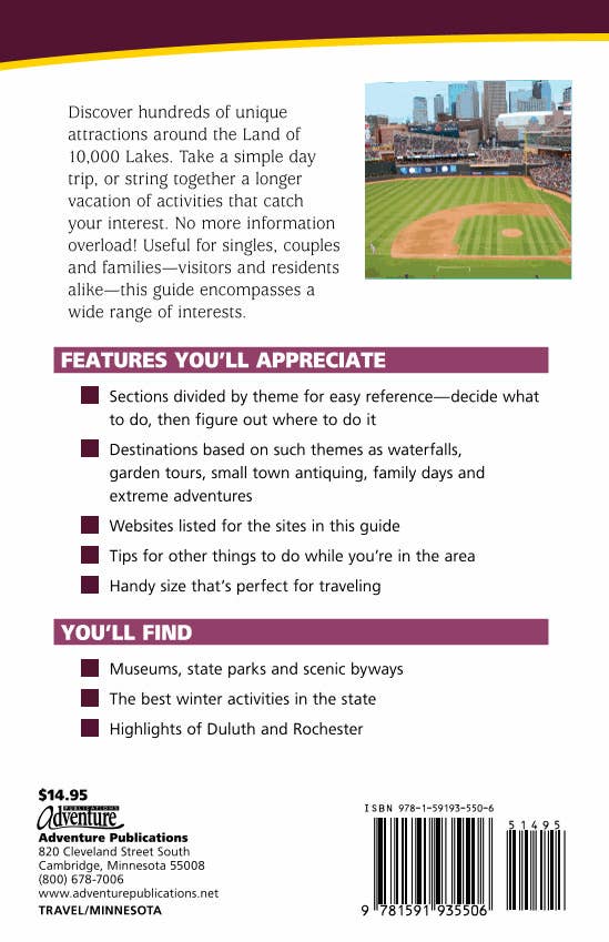 Discover unique attractions around the Land of 10,000 Lakes! Take a simple day trip, or string together a longer vacation of activities that catch your interest. No more information overload! Destinations in the book are based on such themes as waterfalls, garden tours, family days and extreme adventures, so you can decide what to do and then figure out where to do it. Useful for singles, couples and families, visitors and residents alike; this guide by Mary M. Bauer encompasses a wide range of interests.