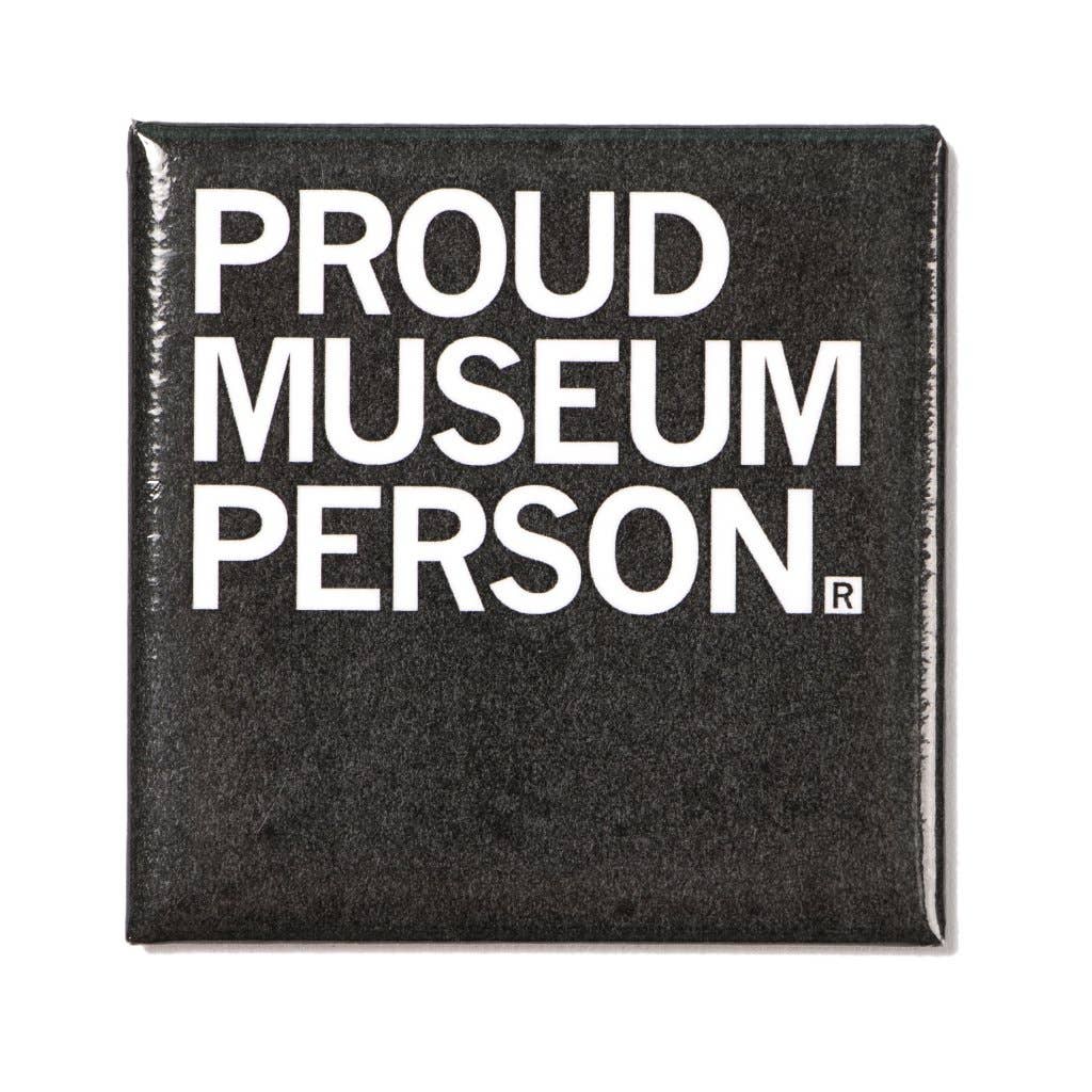 Proud Museum Person. 2" x 2" Metal Magnet. Designed by RAYGUN and made by union labor at Garner Printing in Des Moines, IA.